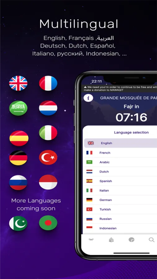 • العربية, English, Français, Español, Deutsch, Italiano, Dutch, Português, Türkçe. More languages are coming incha’Allah.