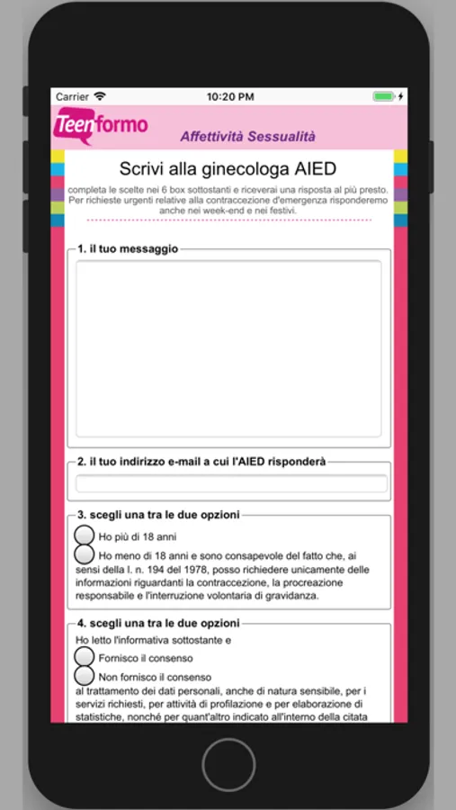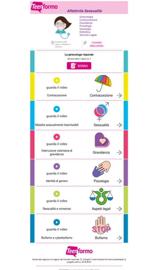 Inoltre, attraverso la sezione SCRIVI ALLA GINECOLOGA, i ragazzi e le ragazze potranno contattare una ginecologa AIED per richiedere informazioni riguardanti la contraccezione e la sessualità libera e consapevole o per sapere come comportarsi per assumere una contraccezione d'emergenza. Oppure, attraverso la stessa sezione, potranno richiedere al Consultorio AIED di inserire nell'APP alcuni temi d'interesse. Il servizio è attivo tutti i giorni.