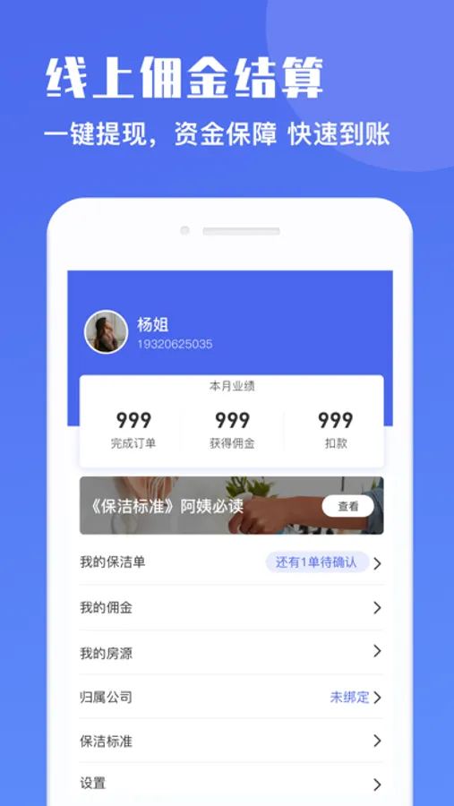 保洁员的移动工作台:认证后可以随时登录系统进行接单-》打扫进展实时上传-》结账-》提现等一系列业务流程操作