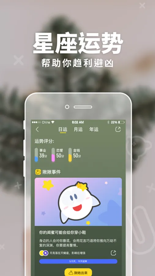 - 揪一揪:我们日常都会受到有不同的星象影响,有来自贵人的帮助也有小人的暗算,在揪一功能中,可以揪出影响你的那个TA;