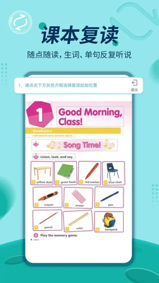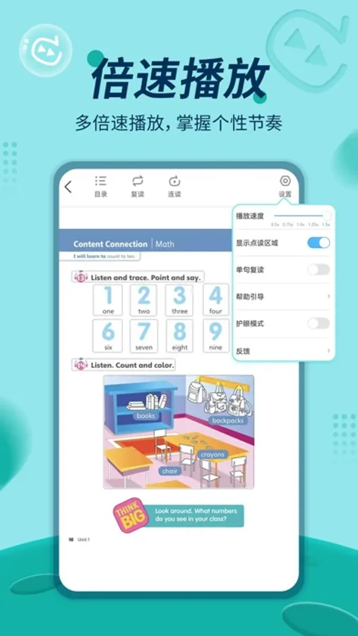 电子点读书支持复读,随点随读,生词、单句反复听说,强化记忆点