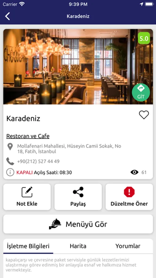 Tüm kayıtlı yeme içme mekanlarının detaylı işletme bilgilerini, konumlarını ve menülerini güncel ve anlık olarak yüzbinlerce müşterimize ve 30 bini aşkın esnafa ulaştırmalarına ve esnafımızın bu yüzlerce seçeneğe aynı anda kolayca ulaşıp görebilmesine ve uygulama üzerinden sipariş verebilmesine imkân sağladık