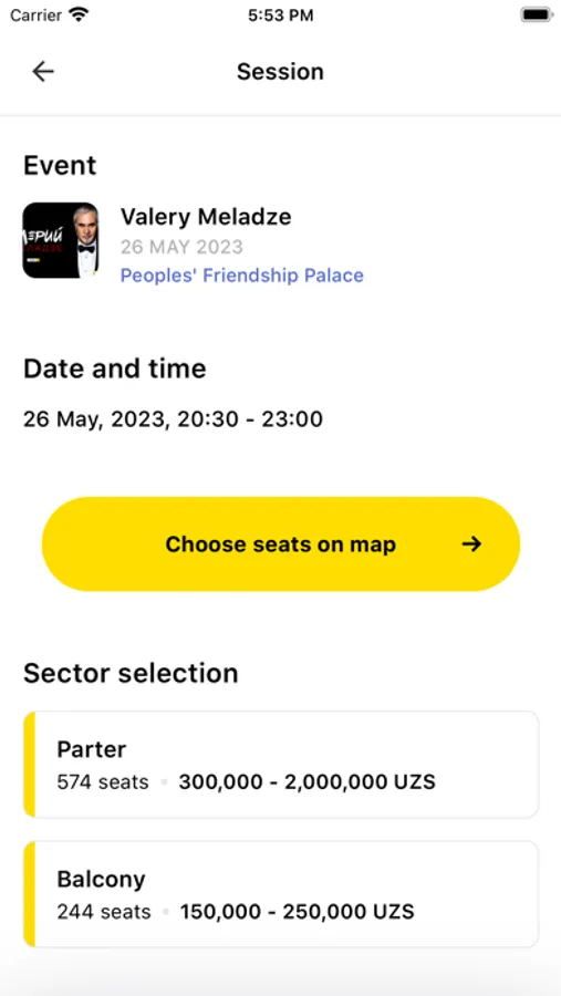 • Convenient selection of tickets for rows and seats, as well as ordinary entrance tickets