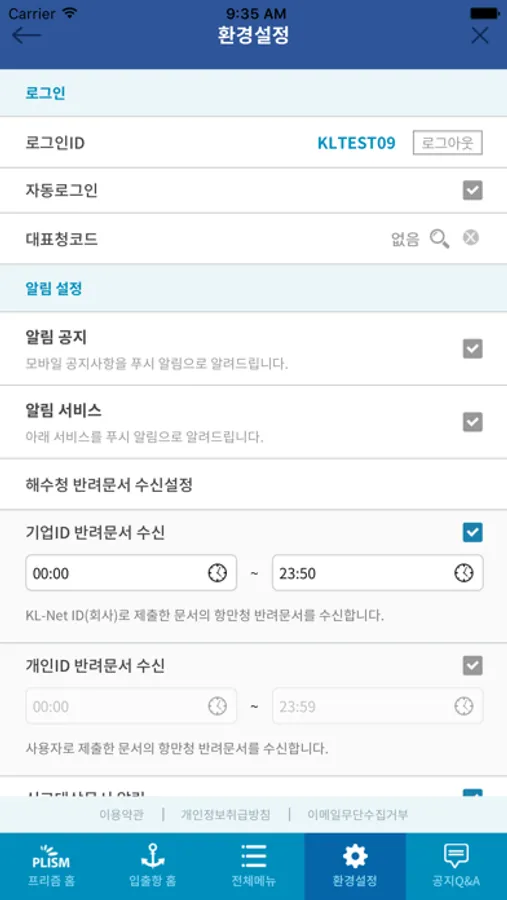 - 항만청 신고 반려문서 알림서비스 설정 및 해제