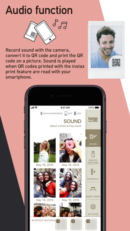 Sound recorded by the camera can be converted to a QR code and made into an instax print along with photos taken.