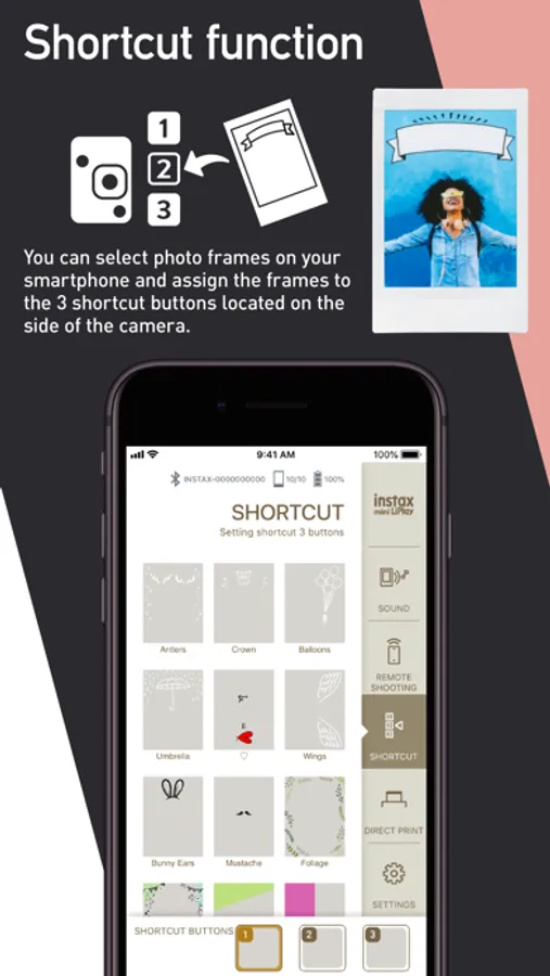 Frames selected with the app can be set as you like to the three shortcut buttons on the side of the camera.