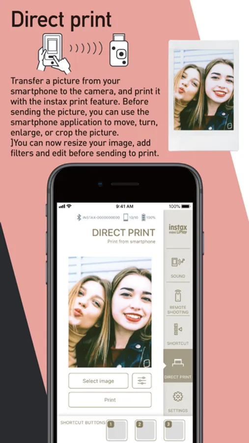 This app is exclusively for the Fujifilm instax mini LiPlay camera. You can enjoy the following functions by connecting the instax mini LiPlay and this app via Bluetooth.