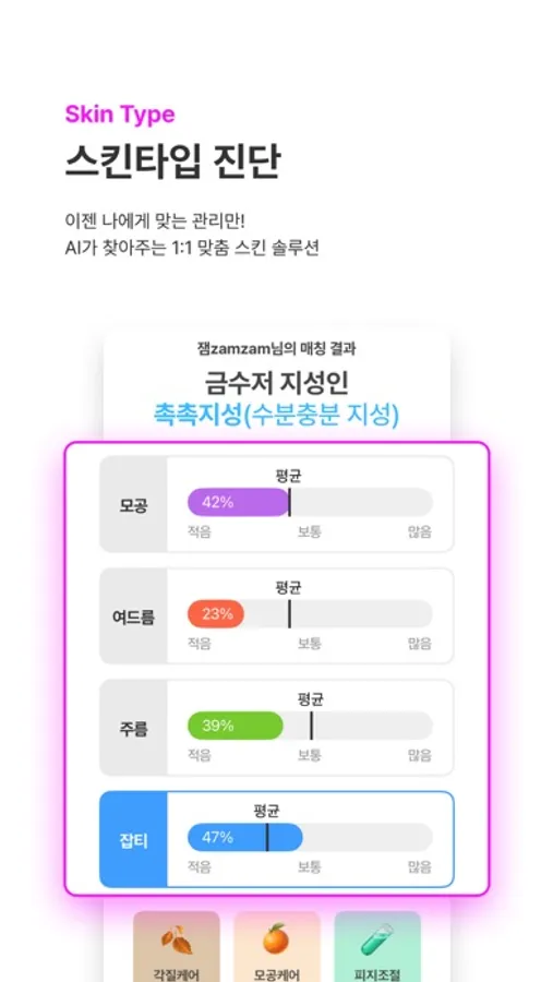 AI 피부 진단과 맞춤 설문으로 간편하게 피부 타입 진단하고,
