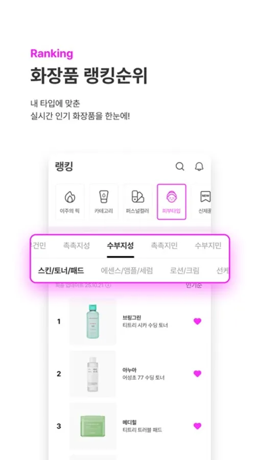 내 피부 타입에 꼭 맞는 스킨케어 제품을 추천 받아보세요.