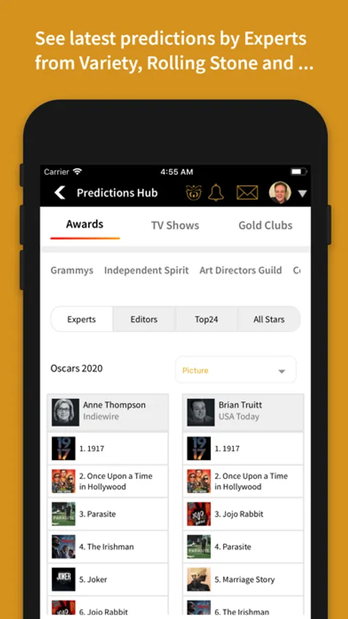You can receive notifications that tip you off when your friends or famous Experts update their predictions. Gold Derby features latest Oscar, Emmy, Grammy and Tony predictions from Experts at Rolling Stone, Variety, Deadline, TVLine, Yahoo, USA Today, Entertainment Weekly and other top media.