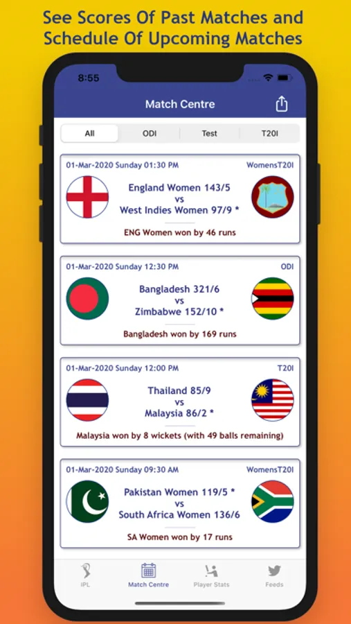 Cricket Fever - Live Cricket App features all international cricket matches - Men's and Women's international tournaments - with ODI, Test, Twenty twenty filters, so that you can easily find and follow your favourite cricket match