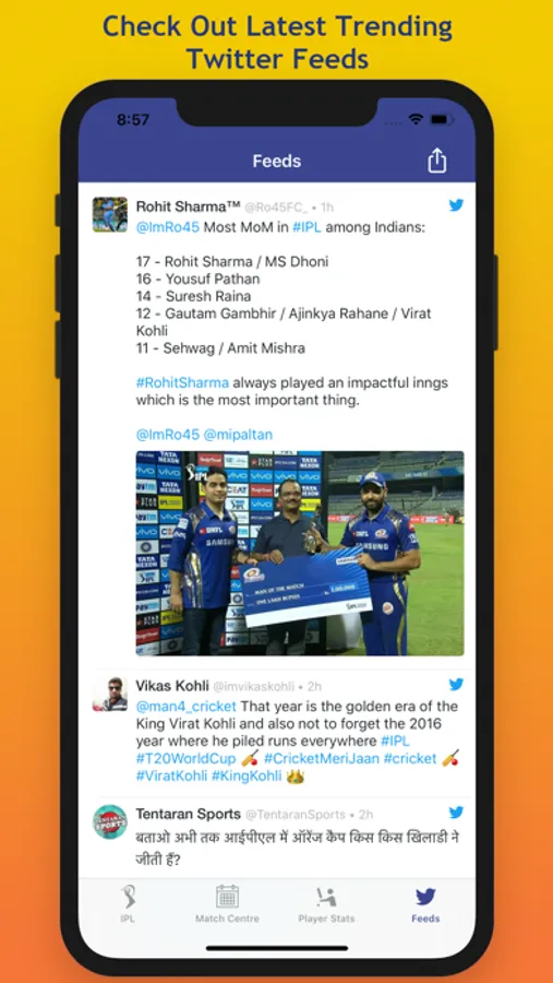 You also get live Tweets about all recent Cricket updates, matches and tournaments.