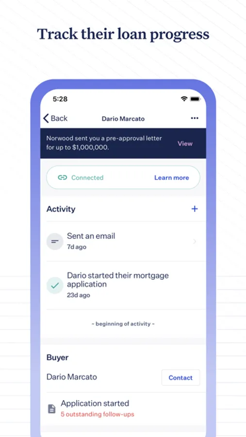 Receive status updates (application completed, pre-approved, appraisal ordered, etc.) for your buyers’ mortgage application, automatically pushed to your phone in real time for lenders with status updates turned on in Blend.