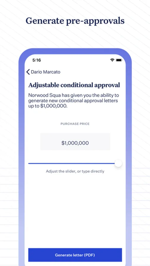 You can have immediate access to custom Pre-Approval or Pre-Qualification letters generated by the lender through the Blend Agent app. Your buyer’s loan officer sets a max pre-approval amount, then you can adjust downward to generate a new PDF whenever needed for different properties.
