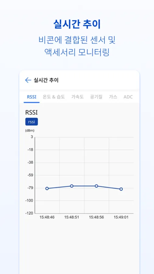 - 비콘의 신호 세기(RSSI)와 BuildThing Beacon에 결합된 센서 정보를 즉시 시각화 할 수 있습니다.