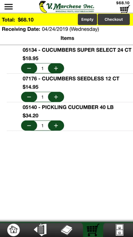 V. Marchese Checkout allows customers that currently have an online ordering account to now place their online orders from the convience of an App. Customers may now enter their orders in V. Marchese Checkout, which will automatically generate an online sales order for them. The V. Marchese Checkout App also provides a screen which allows the customer to send a message directly to their sales representative and/or customer service email group.
