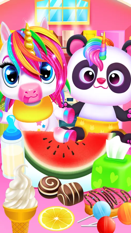 Start your day off with breakfast! Feed Baby Unicorn & Panda some yummy breakfast treats like Rainbow Cereal, Watermelon, Donuts, Candy and more!