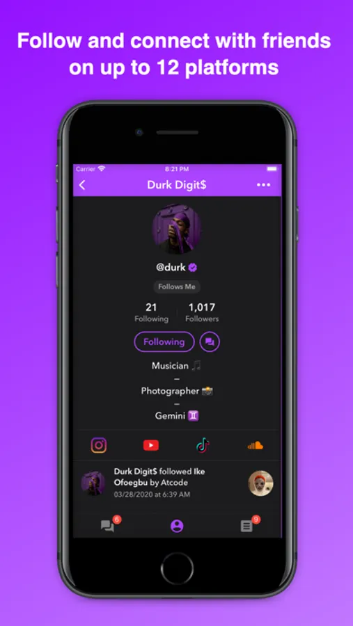 Add up to 12 different social media platforms to your profile and share it with the people you care about the most.