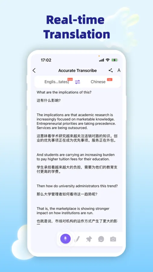 It will perform real-time uninterrupted translation of the sound it hears, and bilingual subtitles will appear. And it will automatically record and export subtitle scripts.