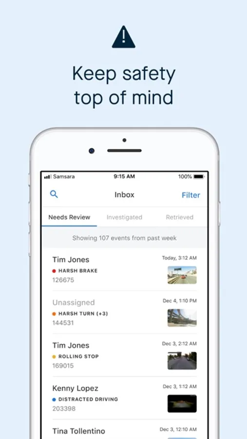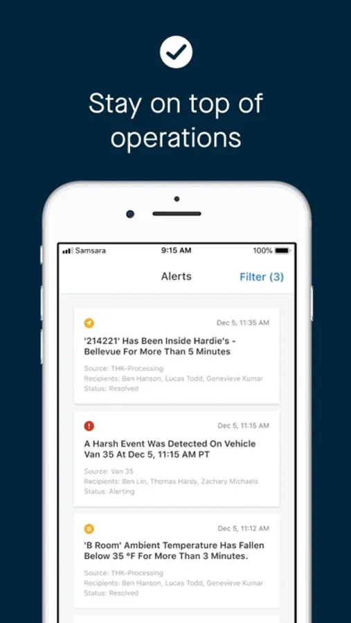 Samsara Fleet is built for fleet managers on the move. Whether you are in the office, in the field, or on your way home, the Samsara Fleet mobile app helps you: