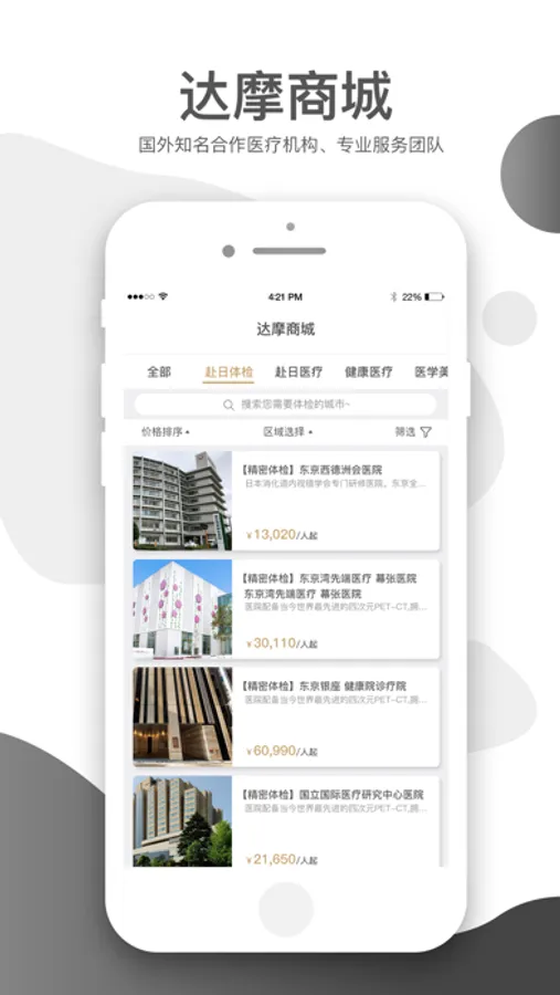 达摩健康关联海外公司成立超过13年,合作日本美国顶尖医院机构超过100家,覆盖精密体检、医疗美容、重症慢病治疗、预防医疗、再生医疗、辅助生育等领域。