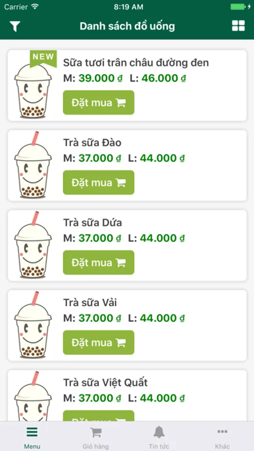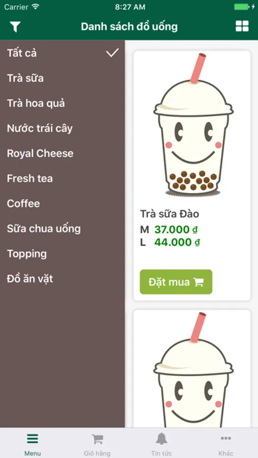 - Trà sữa, trà sữa vị hoa quả, soloca, matcha, hokkaido...