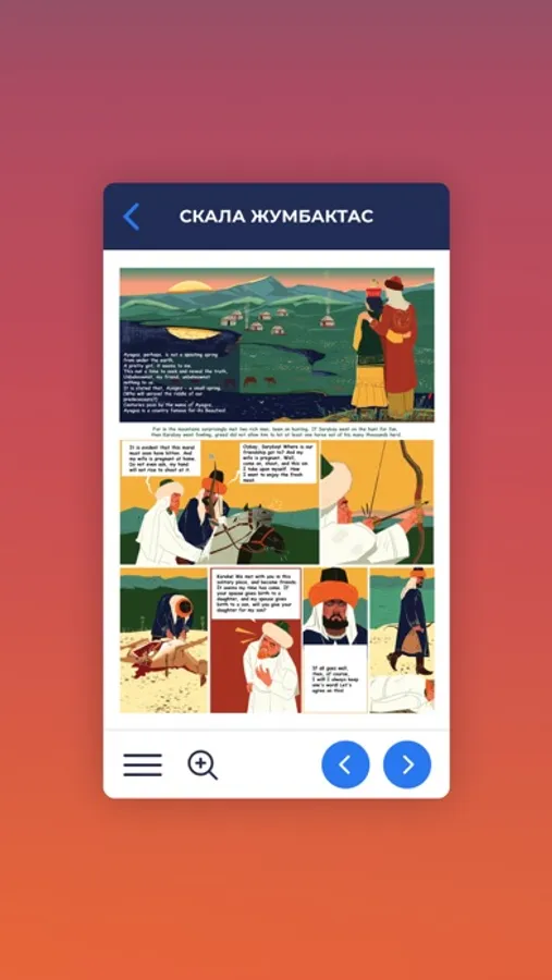 Комикс "Скала Жумбактас". По легенде дочь богатого бая сбежала с возлюбленным, бедным акыном, от своего отца. Но спрятаться молодым не удалось. Сыновья бая своими стрелами убили безродного джигита.
