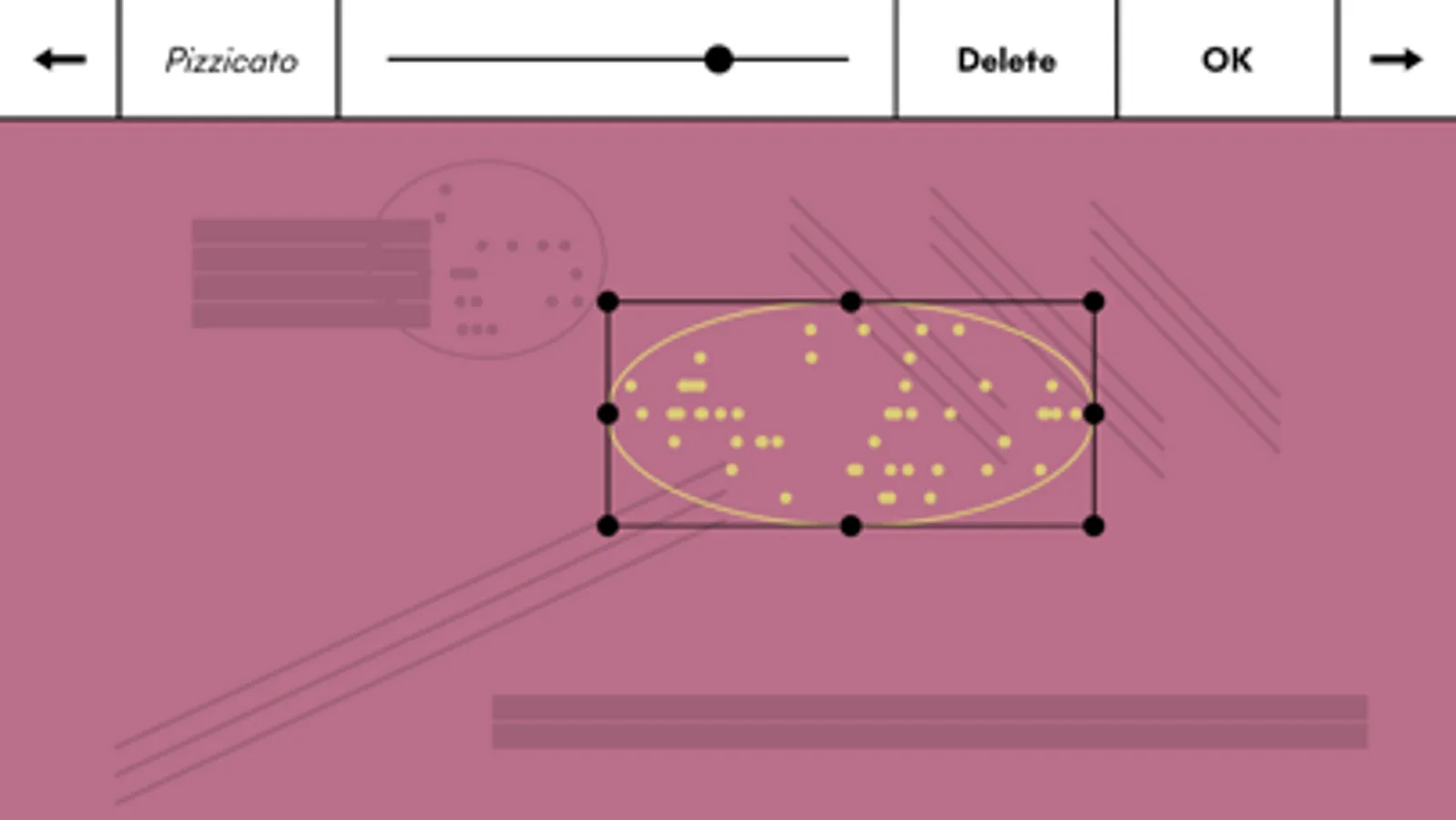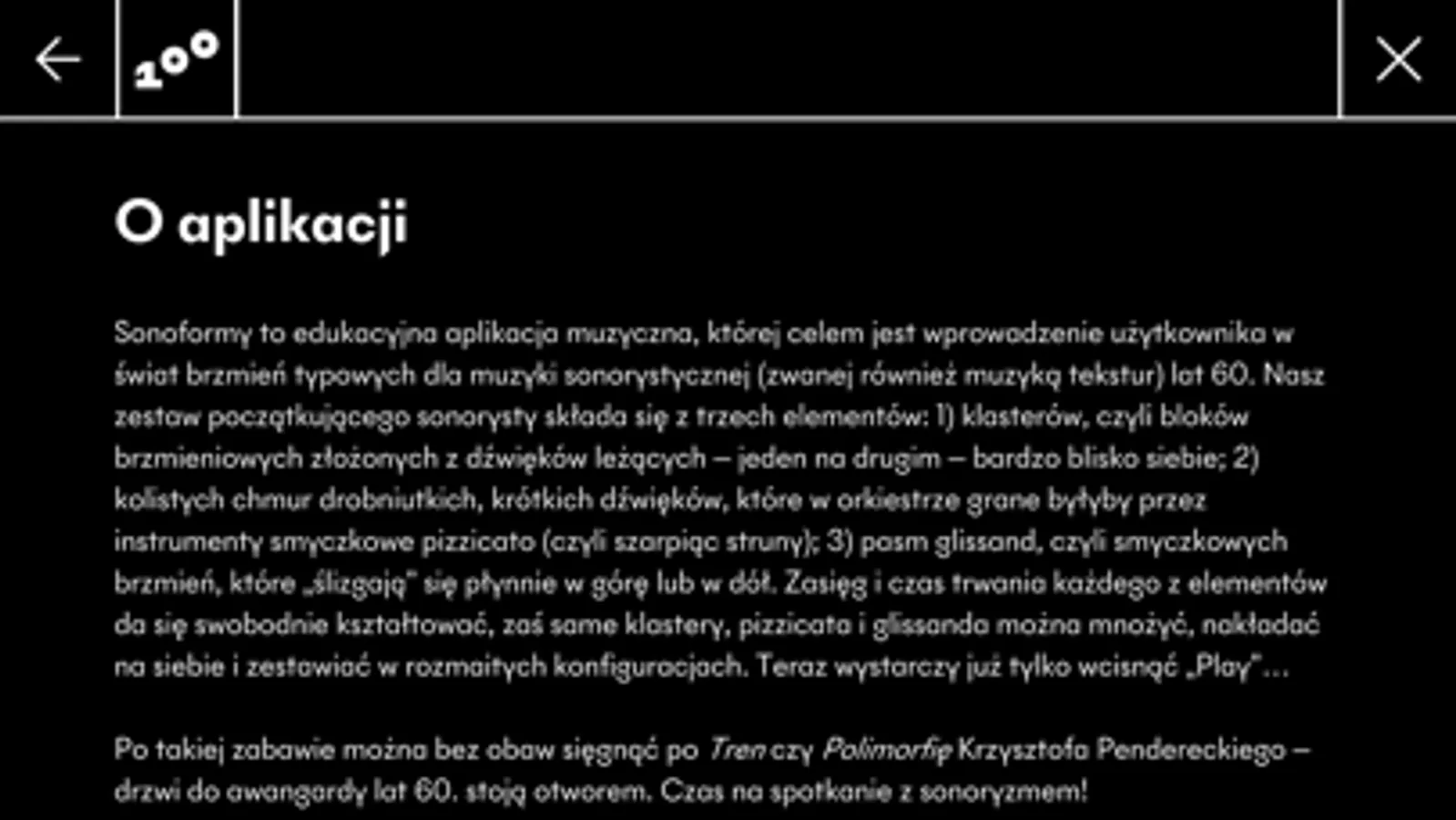 Sonoforms is an educational music application which introduces the audience into the sound world typical of the 1960s sonorism (or ‘music of textures’). Our beginner sonorist’s set consists of three elements: 1) clusters, that is, complex blocks made up of sounds placed vertically on top of one another at very close distances; 2) circular clouds of short and tiny sounds, which an orchestra would perform as a string pizzicato (i.e. plucking the strings); 3) bands or streaks of glissandi, that is, string sounds ‘gliding’ smoothly up and down. The range and duration of each element may be changed freely; the clusters, pizzicati and glissandi may be multiplied, juxtaposed in various configurations and made to overlap. When the music is ready, all you need to do is press “Play”…