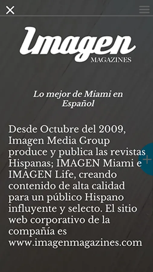 Desde Octubre del 2009, Imagen Media Group produce y publica las revistas Hispanas; IMAGEN Miami e IMAGEN Life, creando contenido de alta calidad para un publico Hispano influyente y selecto. El sitio we corporativo de la compañía es www.imagenmagazines.com
