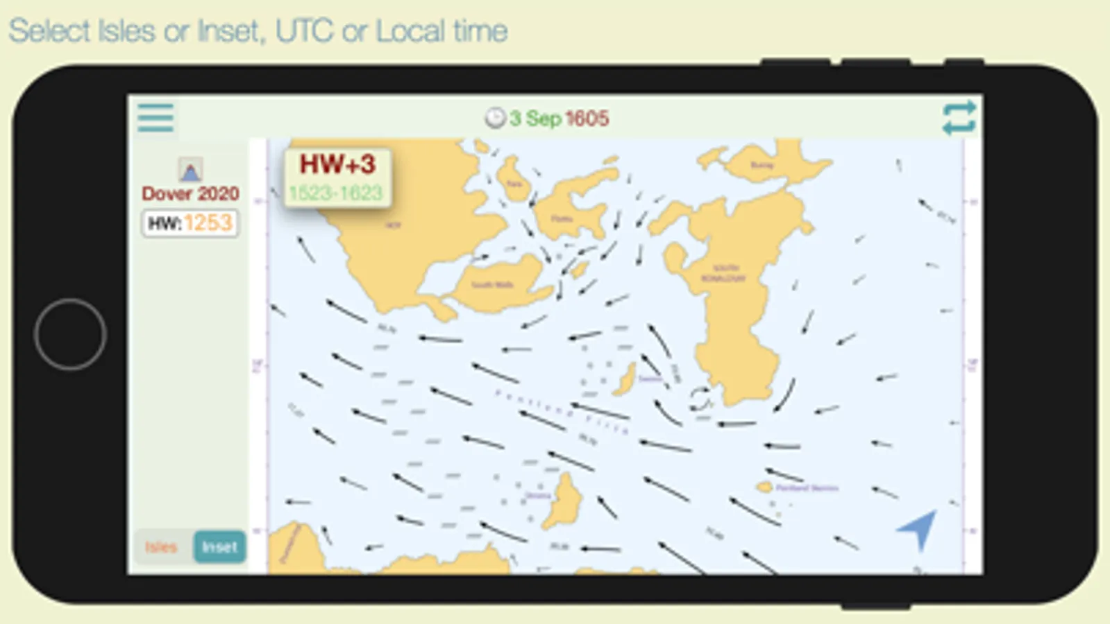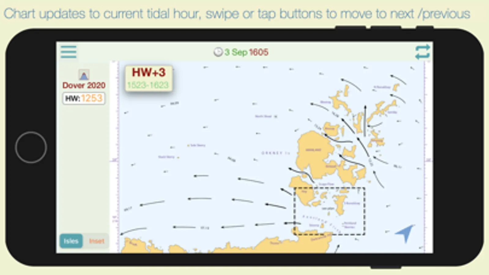 The app automatically selects the nearest Dover HW time of the day, but if you want to see data for the next or previous HW of the day, swipe forward or back to advance the tidal hour.