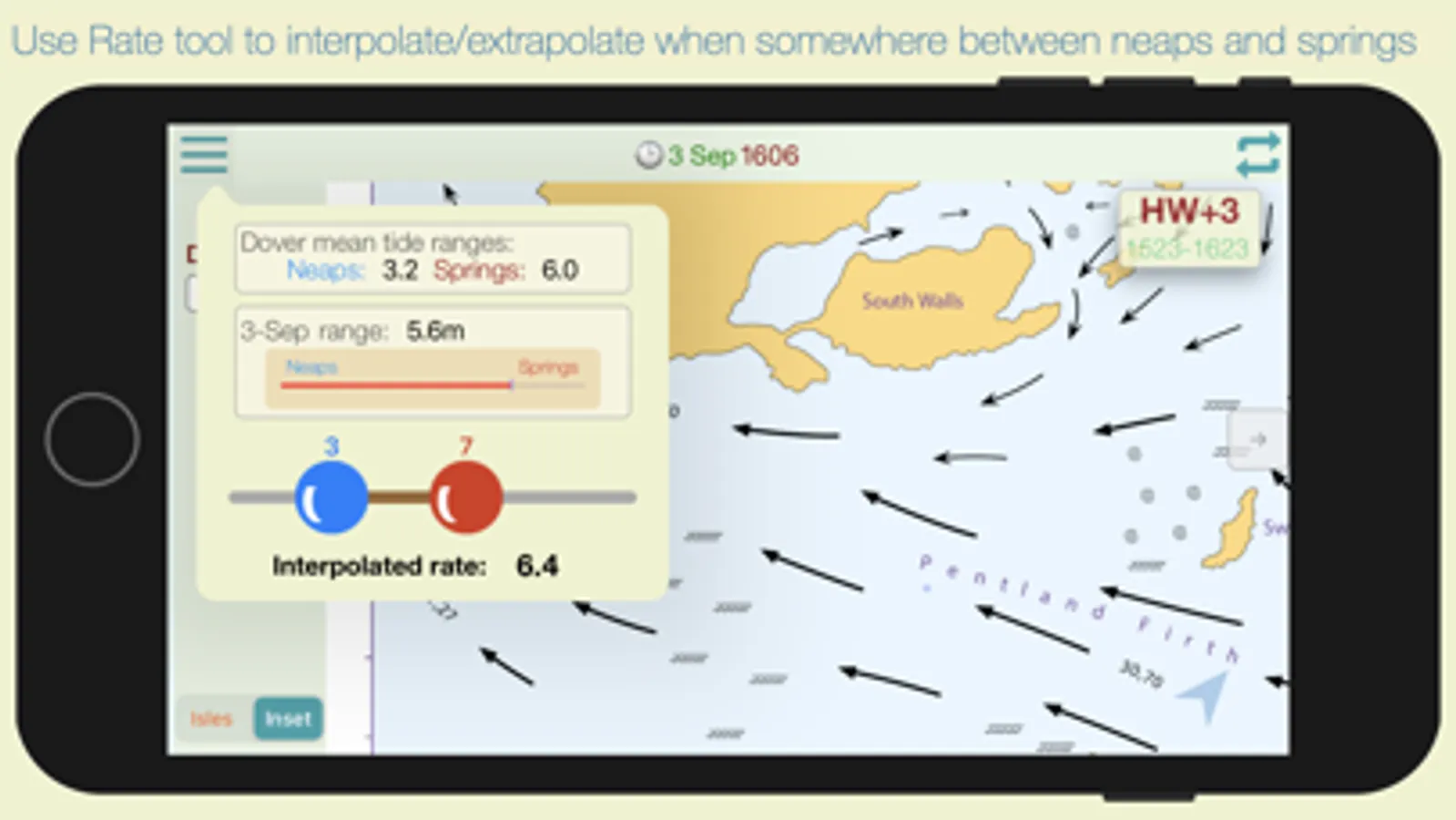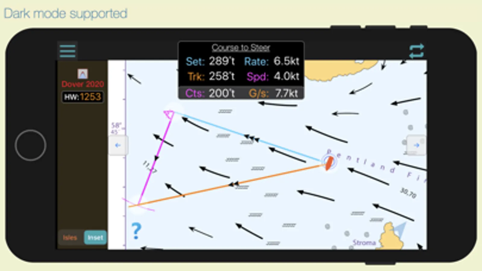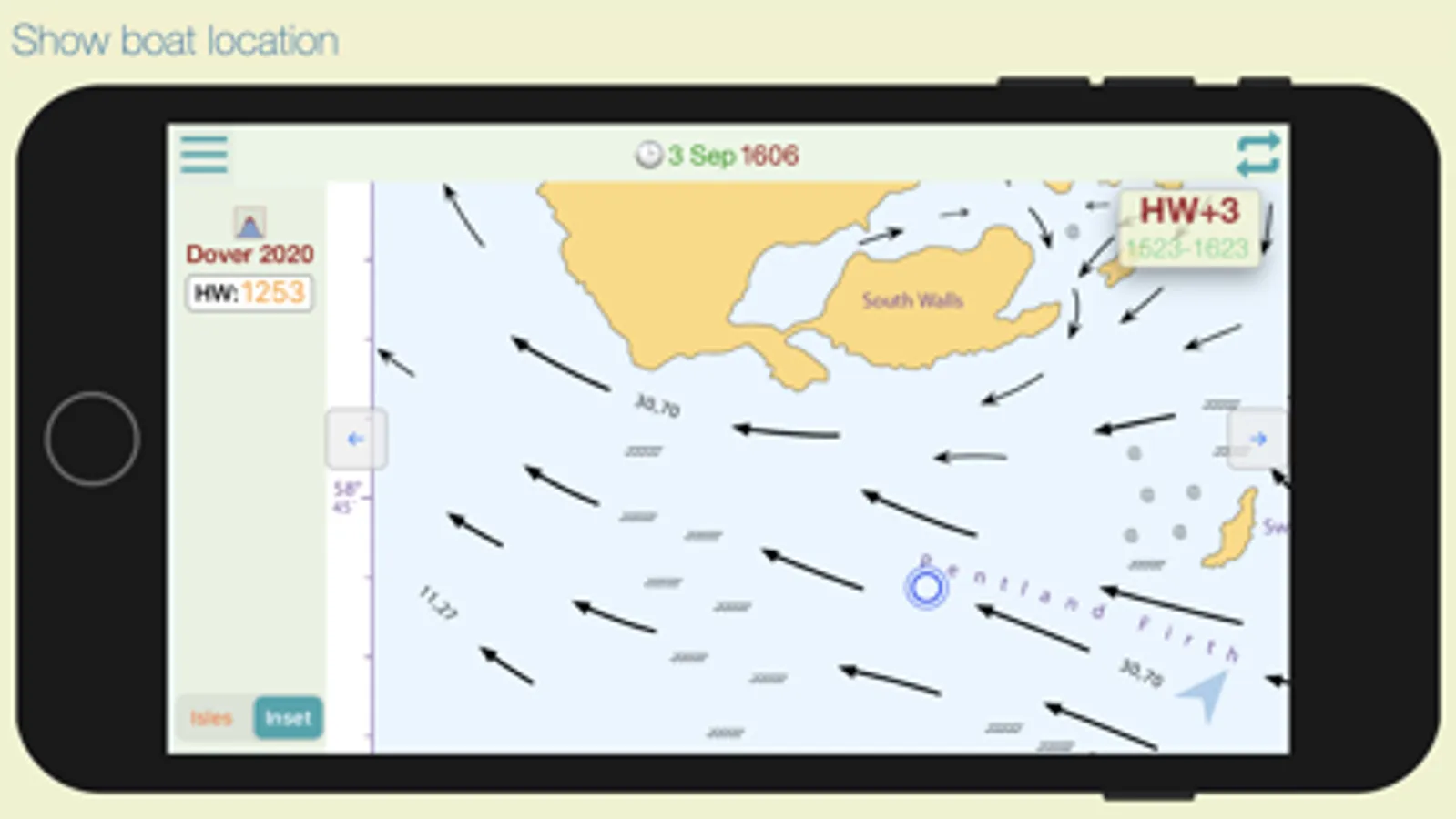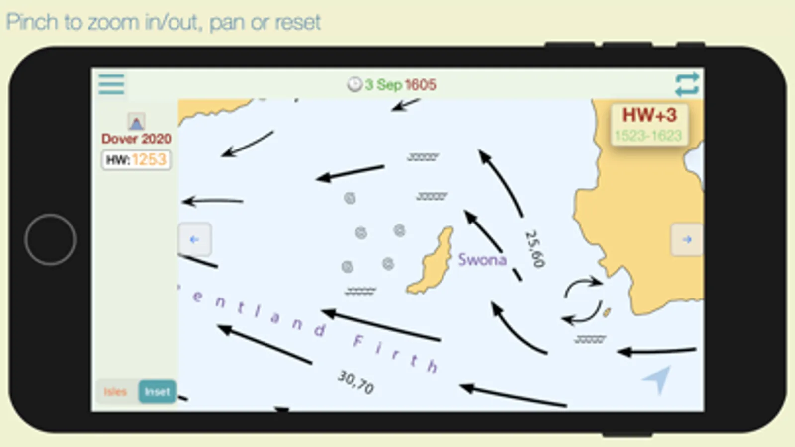 iStreams displays the valid hourly Orkney Islands tidal stream atlas for the current real time, in reference to the time of high water at Dover... a smart app, fully functional offline. With tools to measure tide set and interpolated rate.