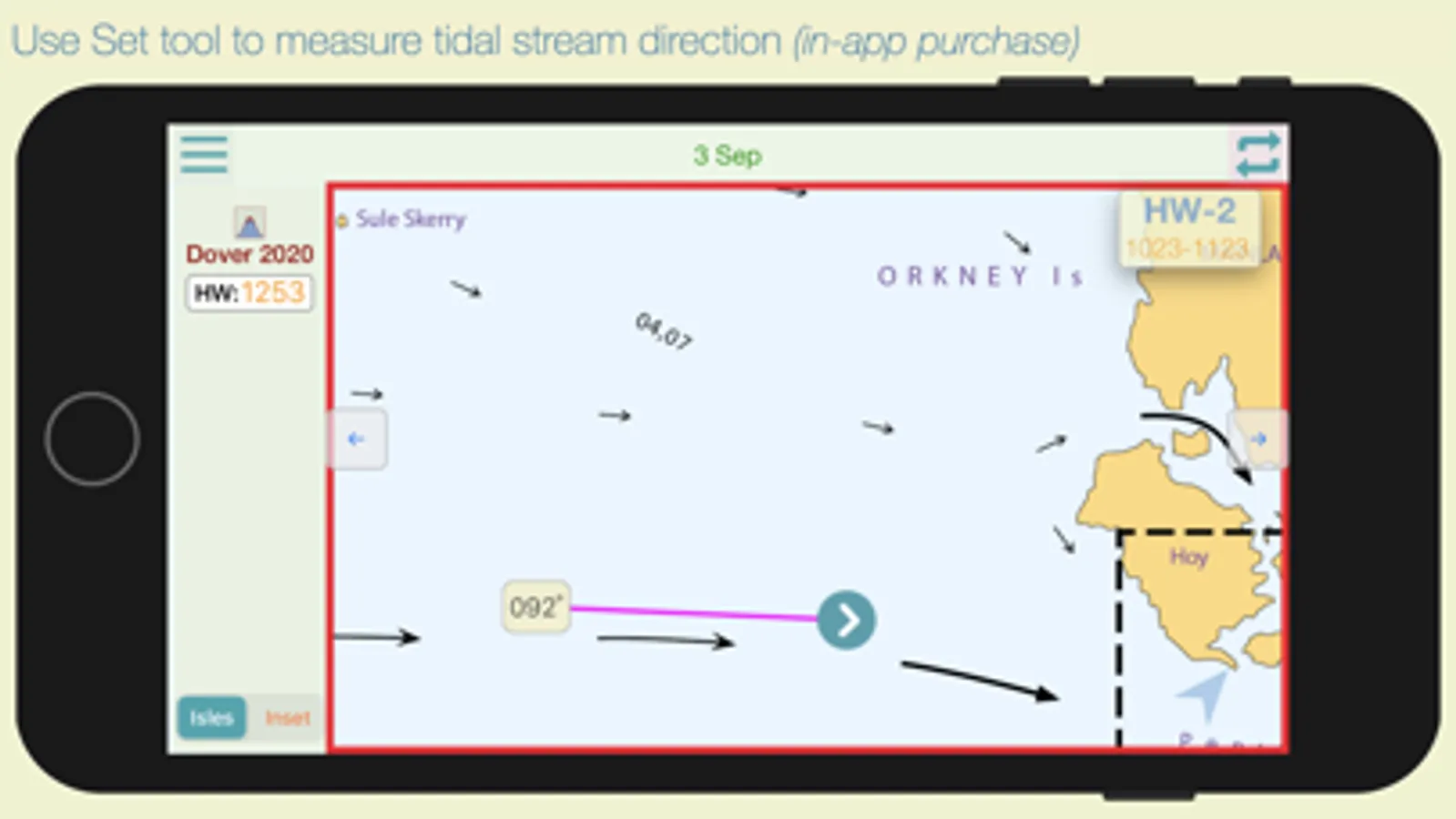 Select the 'Set' tool to measure the precise true course of any tidal stream arrow. (in-app purchase)