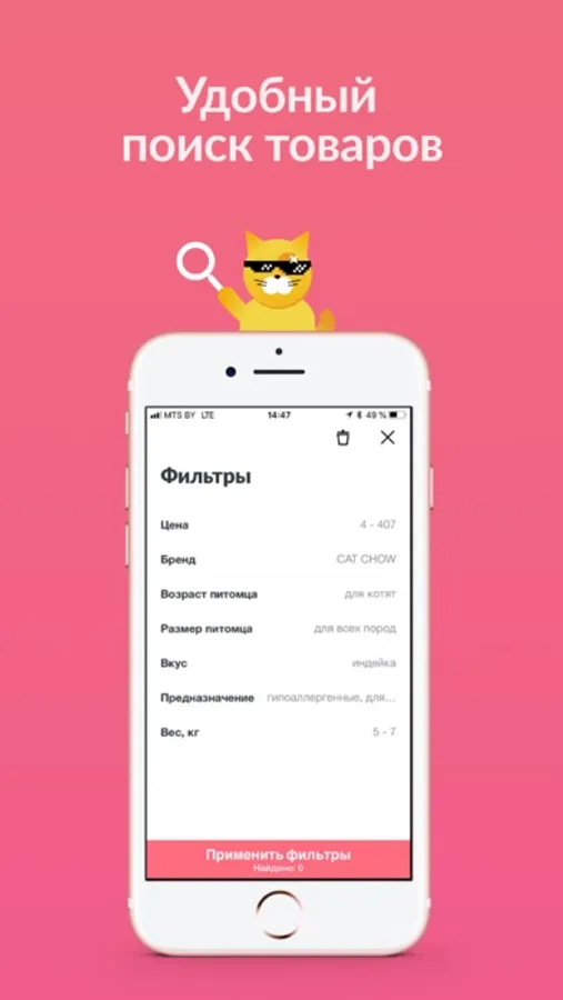 • удобный поиск товаров для животных