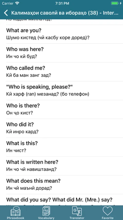 Таджикско-Английский разговорник содержит все необходимые слова и фразы с произношениями, которые могут вам понадобиться во время вашей работы поездки или путешествия. Данное приложение содержит более 1100 фраз, которые отсортированы и сгруппированы по темам. Мы сделали всё чтобы сделать освоение и изучение новых фраз наиболее удобным!