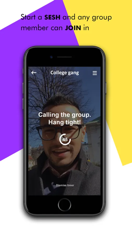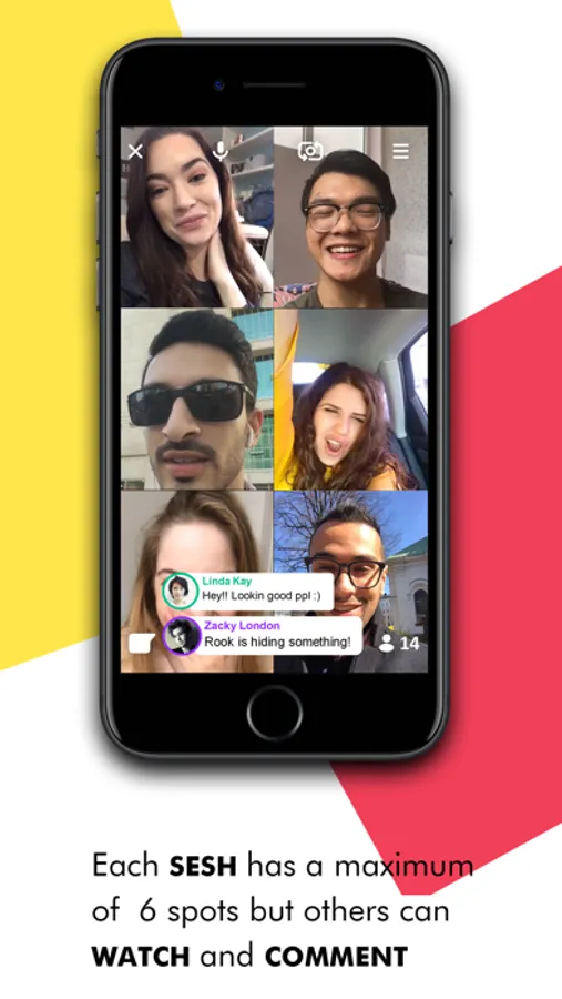 A Sesh is a group video chat which allows you to hang out with your friends as you would in real life. No need to schedule and get everyone to agree on a time. Simply start a Sesh with a group and let people jump in whenever they are available and drop off at their convenience. There are up to 6 video spots at any given time but all members of the group can also participate by watching the conversation and messaging live on screen.