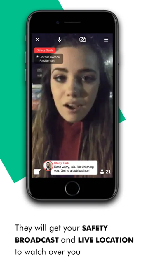 Once you register we ask you to set up your Safety Sesh by selecting your trusted contacts. Now whenever you feel even slightly unsafe (e.g. while on a cab ride or walking home alone), simply start a Safety Sesh (the purple row always on screen) to share your live broadcast feed and location with your trusted Safety Sesh contacts to ensure your safety. This way they can keep an eye on you until you feel safe again.