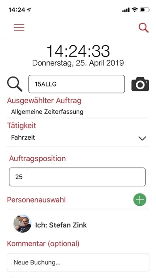 Buchen Sie Ihre Zeiten auf Aufträge oder Tätigkeiten durch abscannen des passenden Barcodes, oder erfassen Sie Ihre Daten über die integrierte Suche.