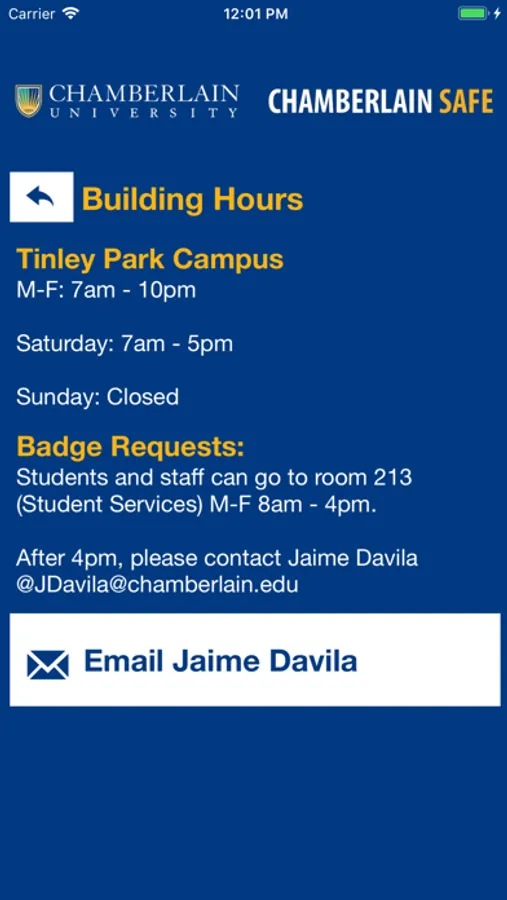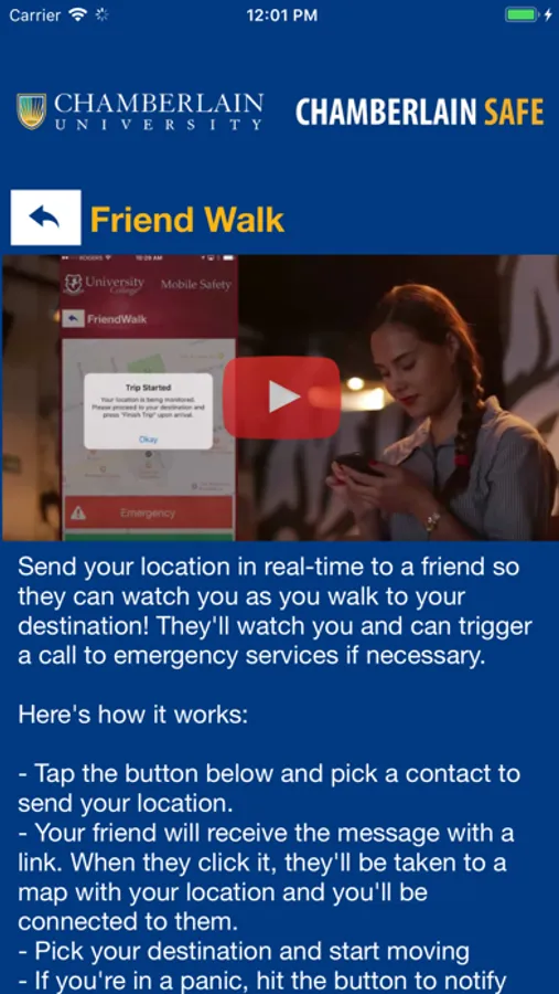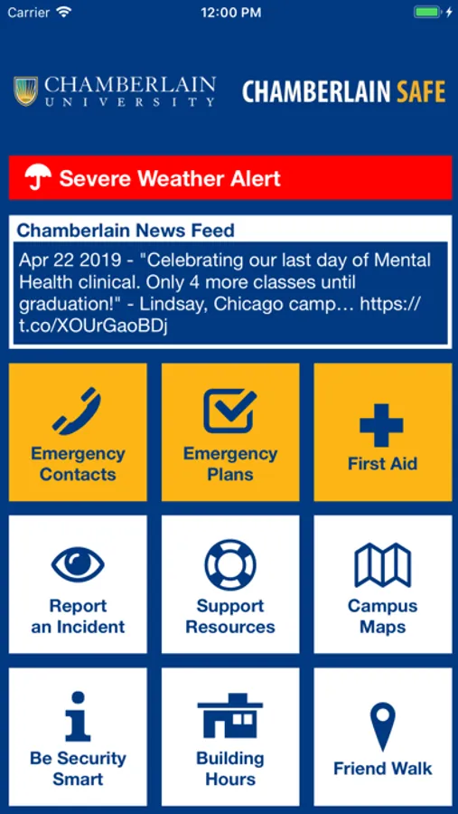 - Safety Notifications: Receive instant notifications and instructions from Chamberlain University safety when on-campus emergencies occur.