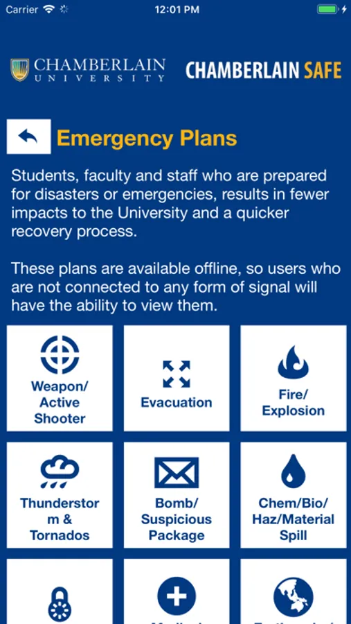 - Emergency Plans: Campus emergency documentation that can prepare you for disasters or emergencies. This can be accessed even when users aren’t connected to Wi-Fi or cellular data.