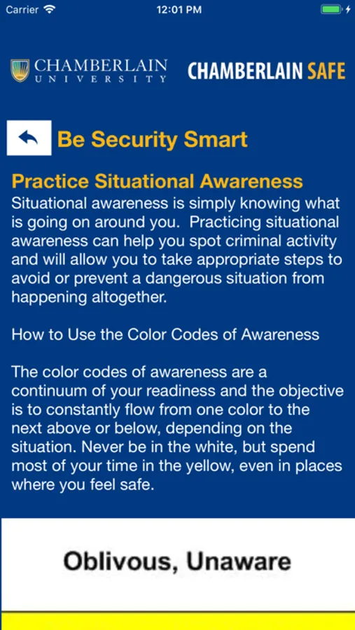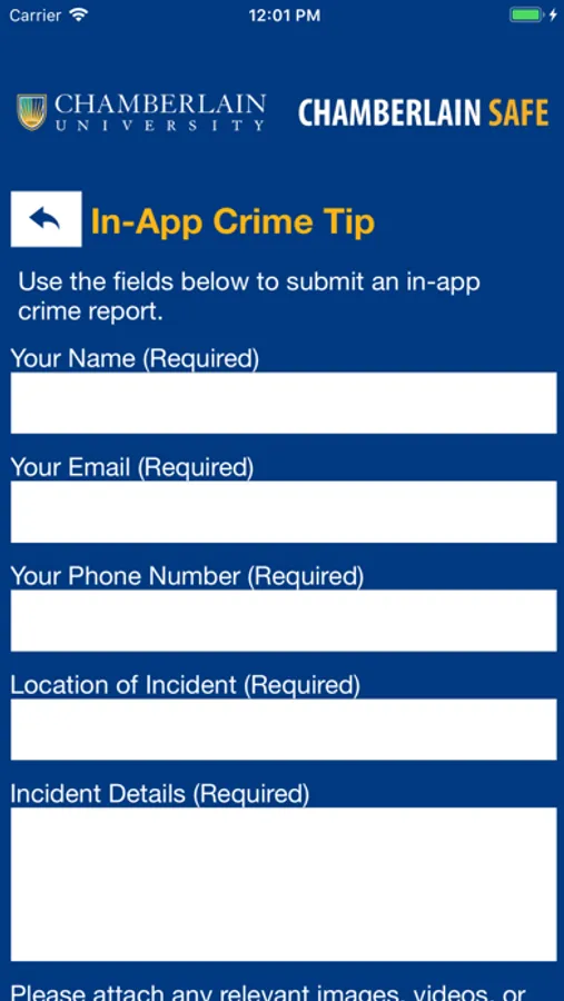 - Tip Reporting: Multiple ways to report a safety/security concern directly to Chamberlain University security.