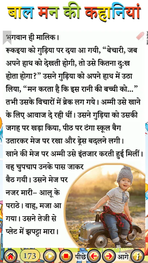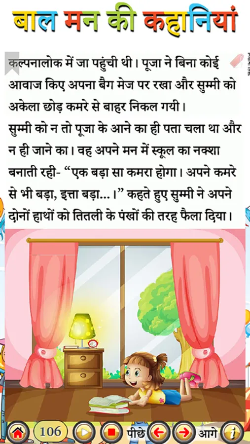 'बाल मन की कहानियां' एक बाल कहानी संग्रह ऐप है। इस ऐप में 20 रोचक कहानियां संग्रहीत हैं। सभी पृष्ठों के लिए ध्वनि जोड़ी गई है। उपयोगकर्ता पृष्ठ ध्वनि सुनने के लिए शीर्ष प्ले बटन का उपयोग कर सकते हैं या अलग-अलग पैराग्राफ पर क्लिक कर सकते हैं।