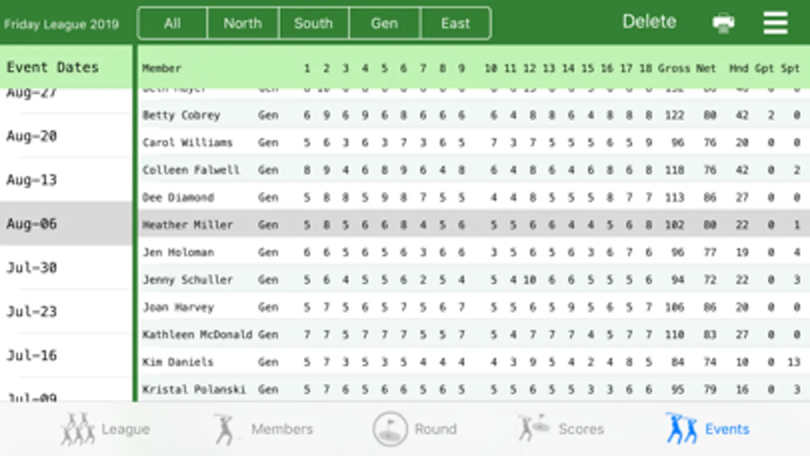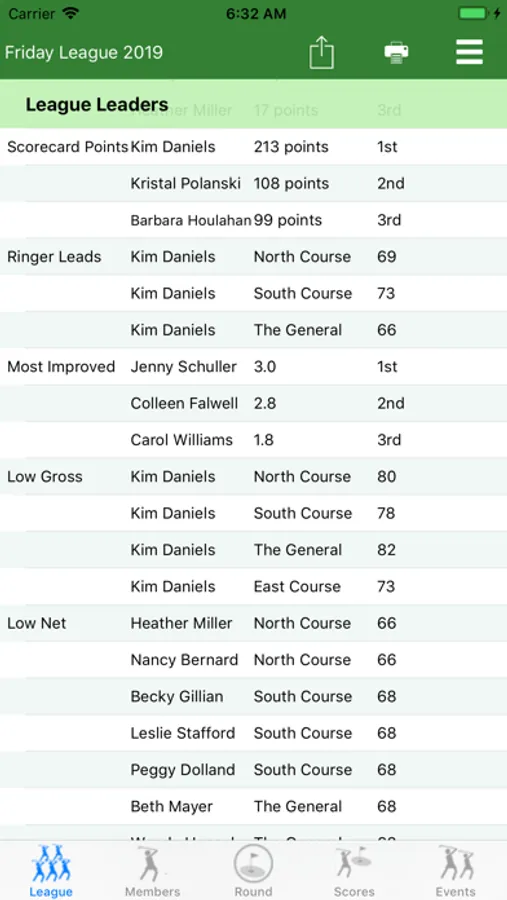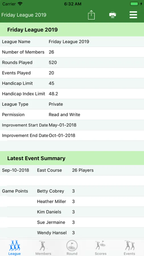 The app league view provides summaries and results from the latest event and the season to date. Event results include options for game points (points awarded for each event team or member game), scorecard points (points awarded for good holes), chip-ins, low gross and low net. Season to date results also include member ringers and most improved index.