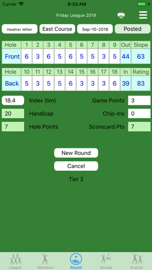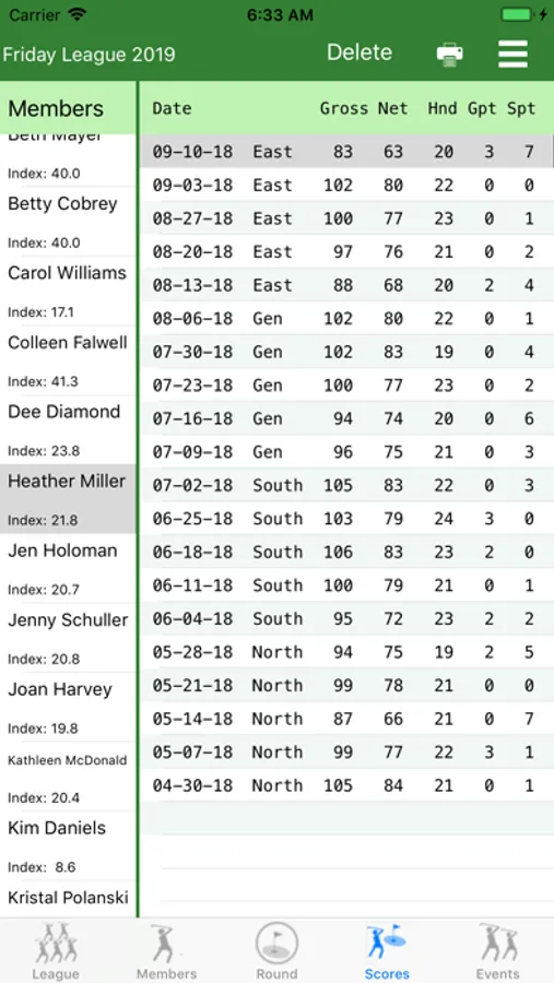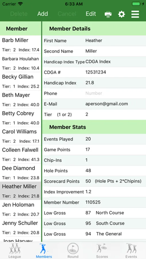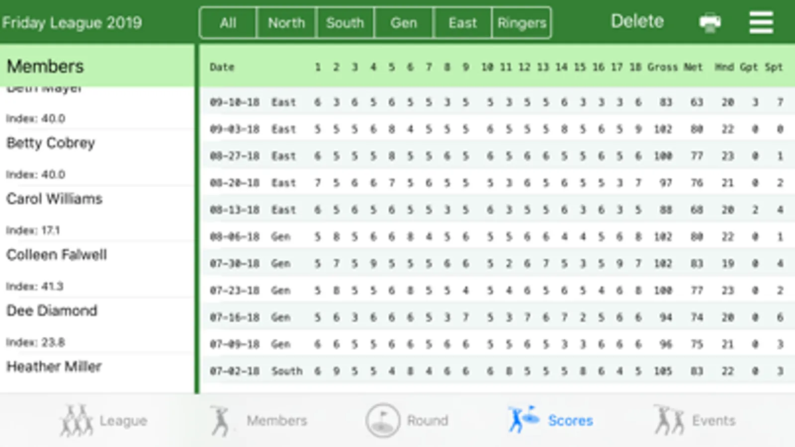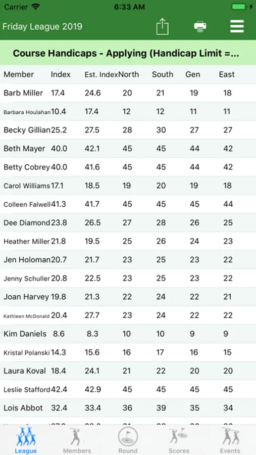 If players have CDGA or GHIN membership, you can download their handicap indexes and get your course handicaps before events. Otherwise, the app can calculate and provide handicaps based on league scoring. Handicap and index limits can also be set for the league.