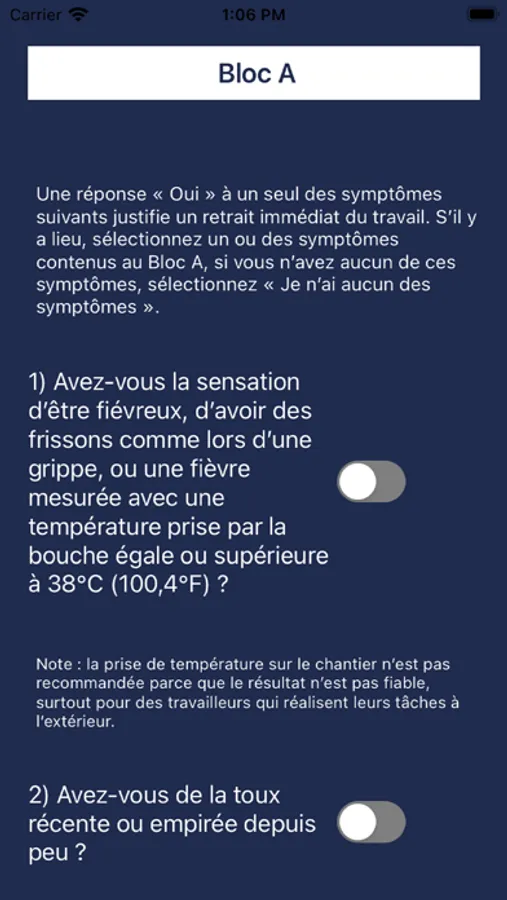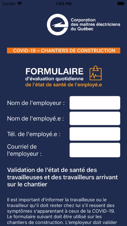 - Possibilité de compléter le Formulaire d'évaluation quotidienne de l’état de santé de l’employé.e tel que recommandé par la CNESST dans le Guide de normes sanitaires en milieu de travail pour le secteur de la construction – COVID-19.