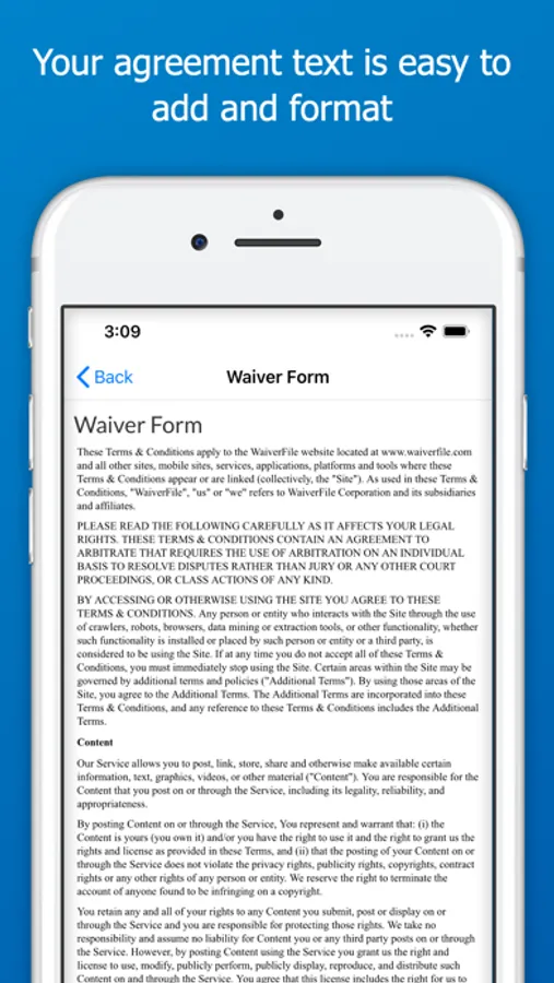 WaiverFile is an online waiver form service that takes your liability waivers and makes them paperless. Your customers can sign their waiver in advance online with any device. Our iOS app adds offline signing so you can collect customer waivers even when you have no internet connection. Collect the signatures and when your device is back online, the data is synchronized with our service and stored securely in the cloud.