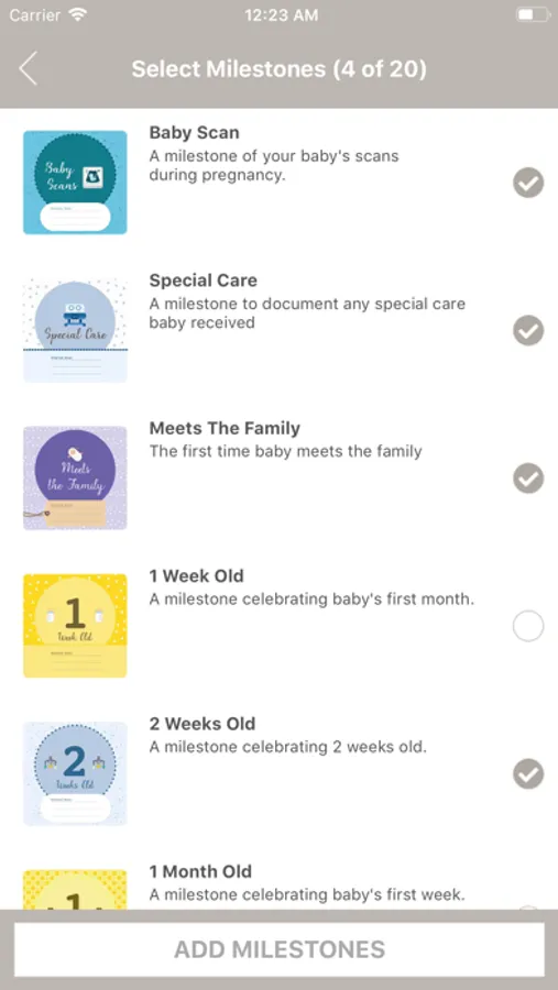 > Use our app to select your baby's milestones. There are many options to choose. From age milestones to important events.