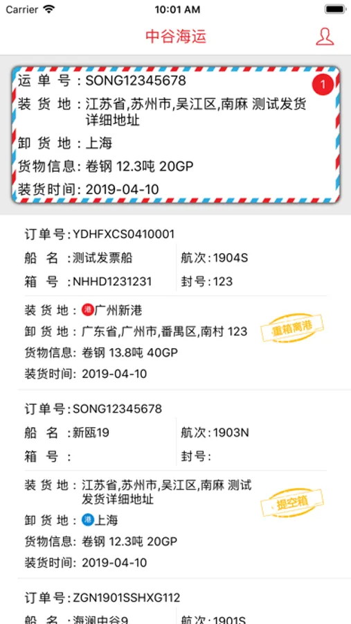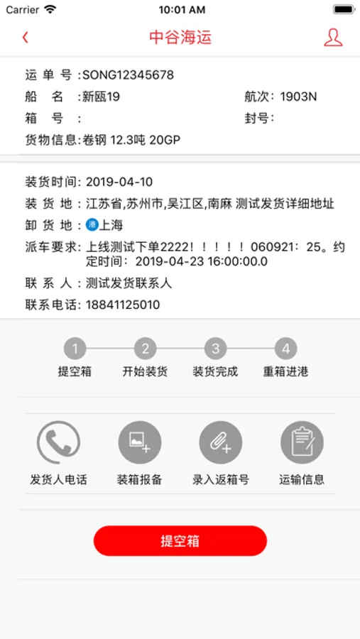 2.进行工作阶段的反馈(进口运输包括重箱离港、送达门店、签收完成、空箱处理等操作,出口包括提空箱、开始装货、装货完成、重箱进港等操作),操作简单方便,一键更新工作状态。
