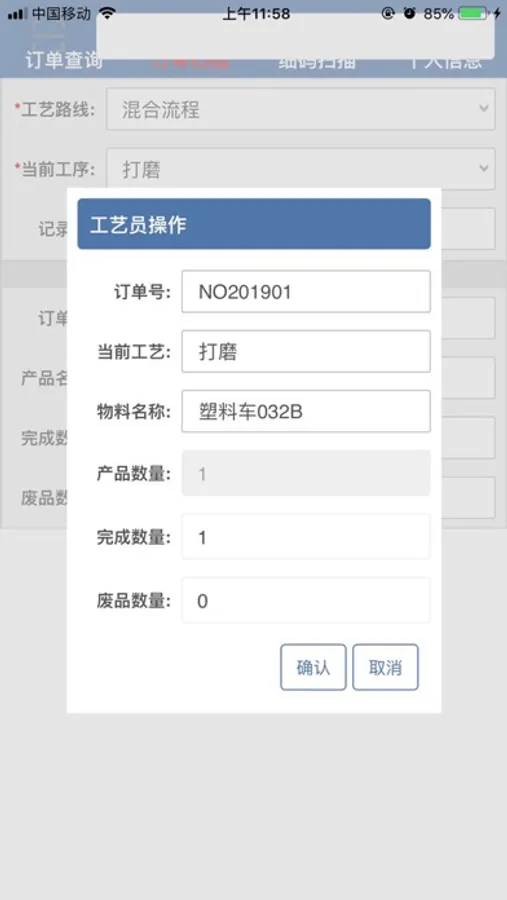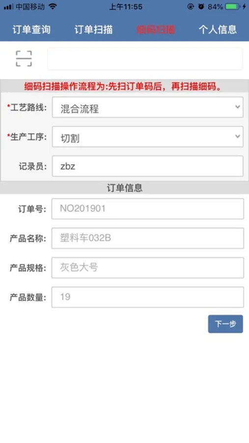 可通过生产扫码系统App访问我司的生产扫码系统,此系统通过手机或者其他移动设备进行工艺工序跟踪及完成情况,主要以二维码扫码方式进行工序产量录入,本app功能包含:订单扫码报工、细码扫码报工、订单查询、个人页面。
