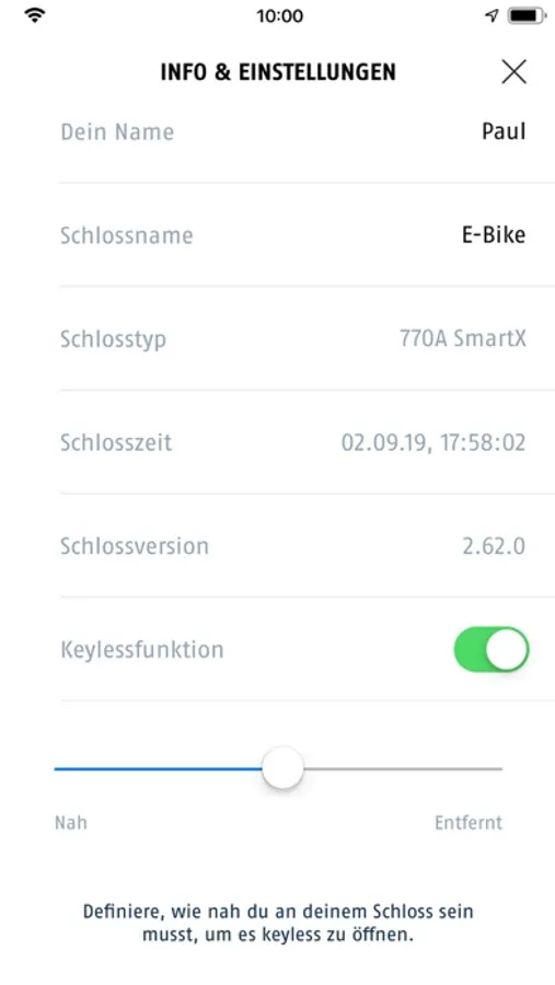and allows for convenient opening and closing of the lock without the need to have your smartphone in your hand. The lock communicates with your smartphone via a secure Bluetooth connection. As soon as you are within a 2-m radius of the lock it can be unlocked.