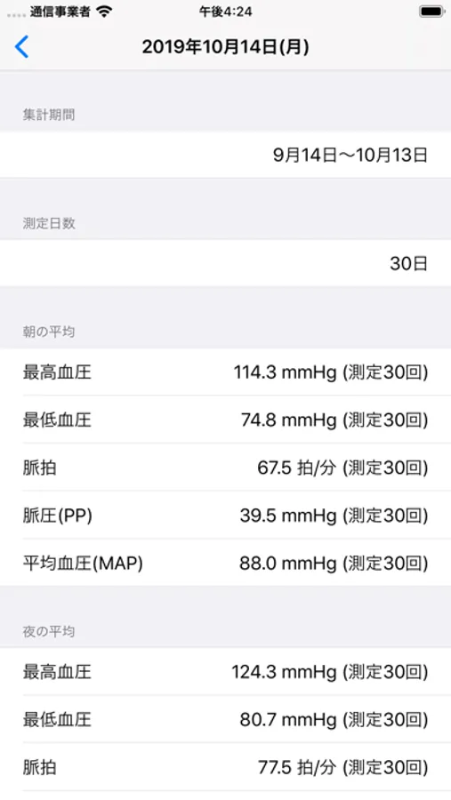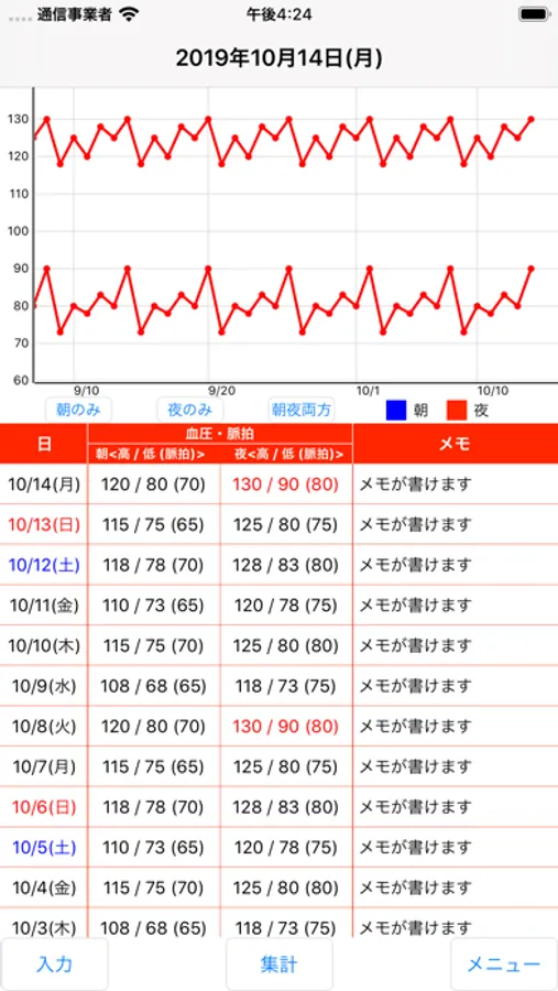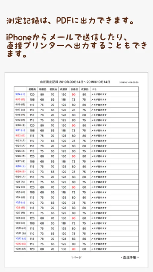 一覧やPDF出力において、高血圧(最高血圧が135以上、または最低血圧が85以上)の時は赤く表示されます。
